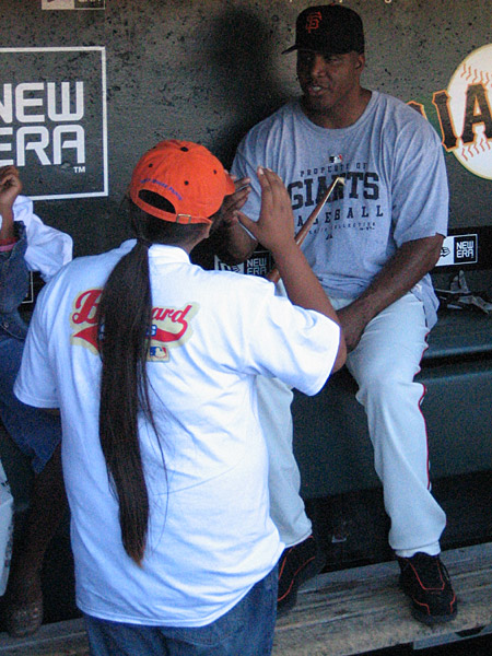 Barry Bonds offers to sign a cap instead of one of his broken bats since the black marker wouldn’t show up on the bat.