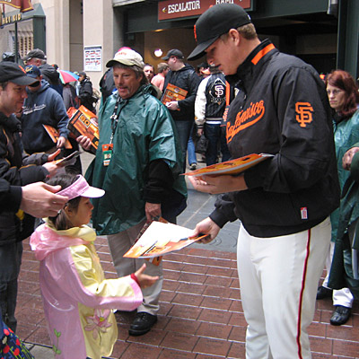 As we sit here hoping the rain holds off long enough to get at least part of this game in (it’s been dry for the last hour), some of the players participated in the now-traditional ritual of handing out Opening Day calendars to unsuspecting fans as they entered the gates at AT&T Park.