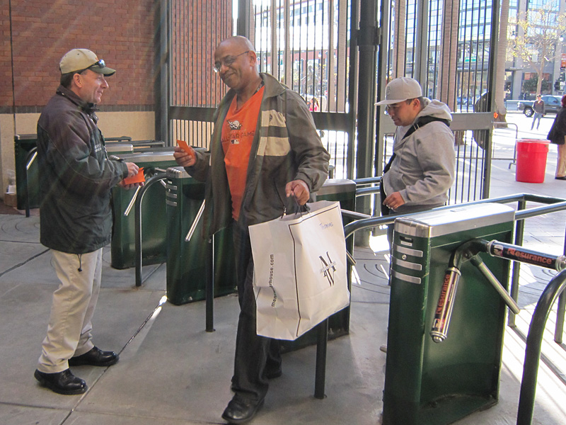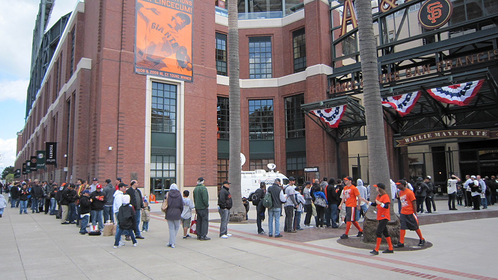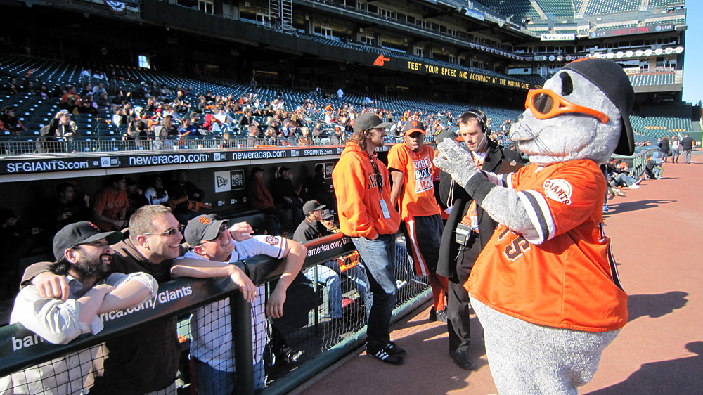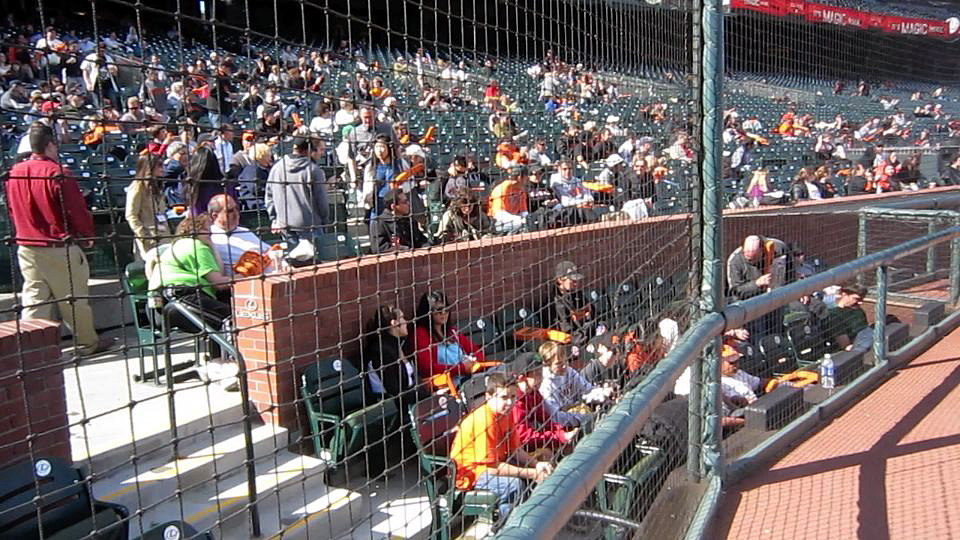 But the fans who showed up to AT&T Park for the CSN Authentic Opening Day viewing party REALLY enjoyed the day. They got to watch the game on the high-def video board, surrounded by fellow orange-and-black faithful, eating a free hot dog and getting an autograph from Vida Blue and Jeffrey Leonard. Here are some of them getting excited for the first at-bat of the season (love the guys jumping out of their skin with excitement in the dugout):