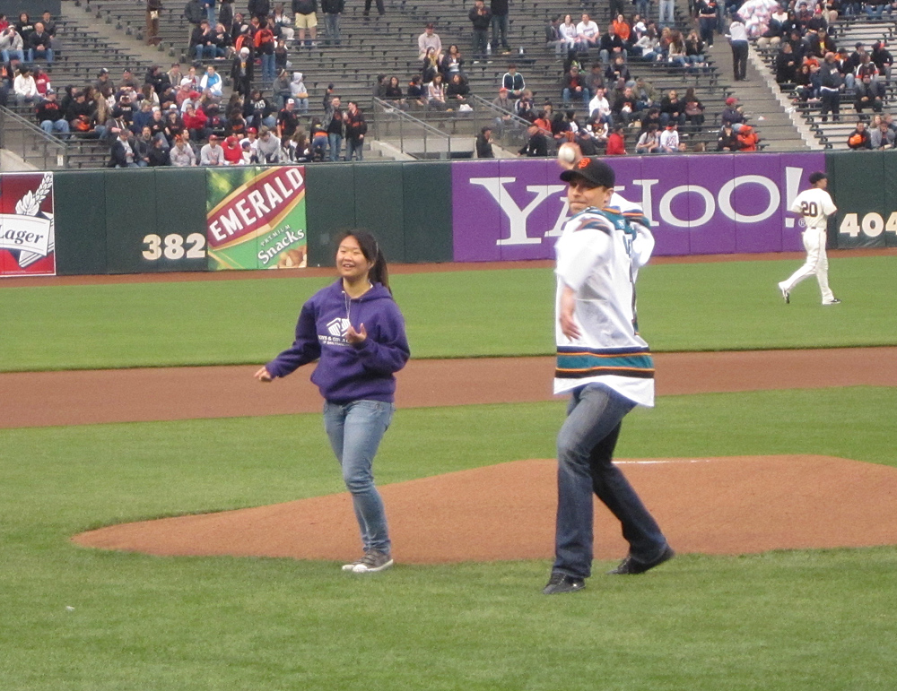 After pulling on his Sharks jersey (or sweater, in hockey parlance), Heatley took the field with Winnie, and while the 17-year-old rainbowed her toss into Sergio Romo‘s glove, Heatley fired the baseball version of a slapshot at Zito. Except his fastball came up a few feet short, and Zito had to make a nifty grab of the one-hopper.